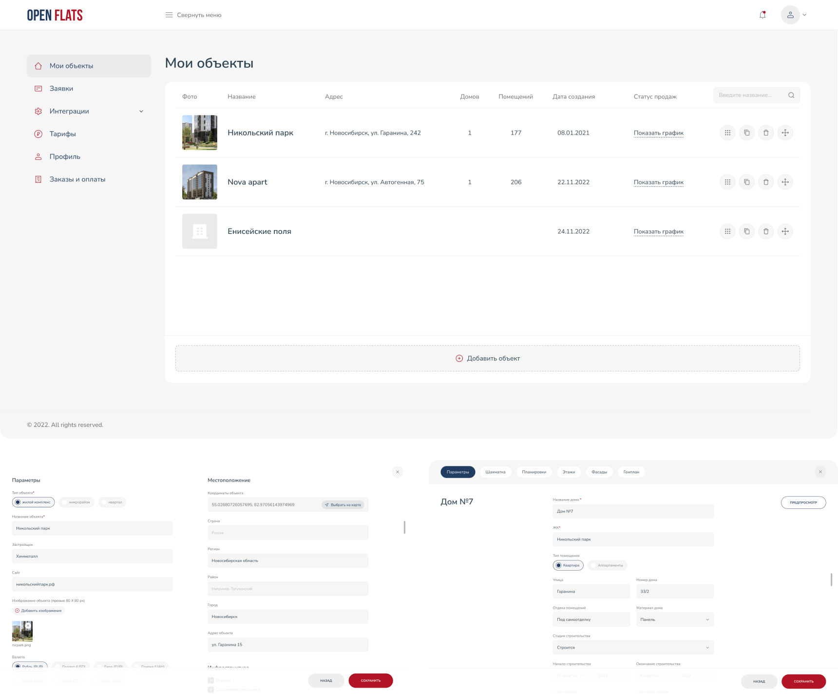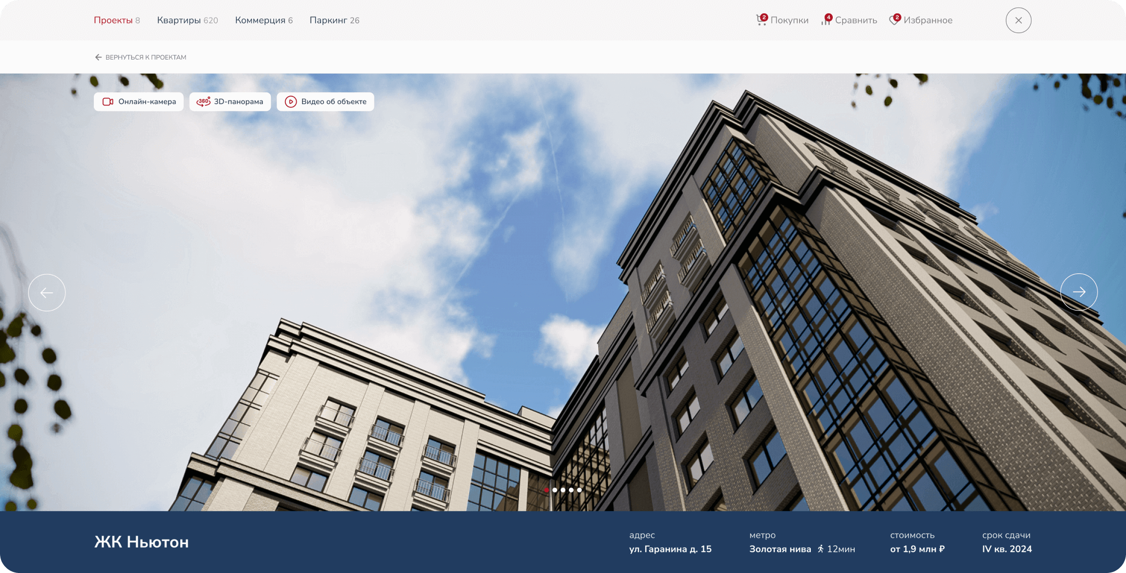 Идея проекта возникла после полутора лет работы с готовыми решениями, представленными на рынке. Ни одно решение до конца не устраивало, особенно из-за скорости работы. В итоге было решено создать собственный каталог для презентации жилых комплексов, а также поиск по планировкам и объектам внутри этих жилых комплексов который включает функционал: