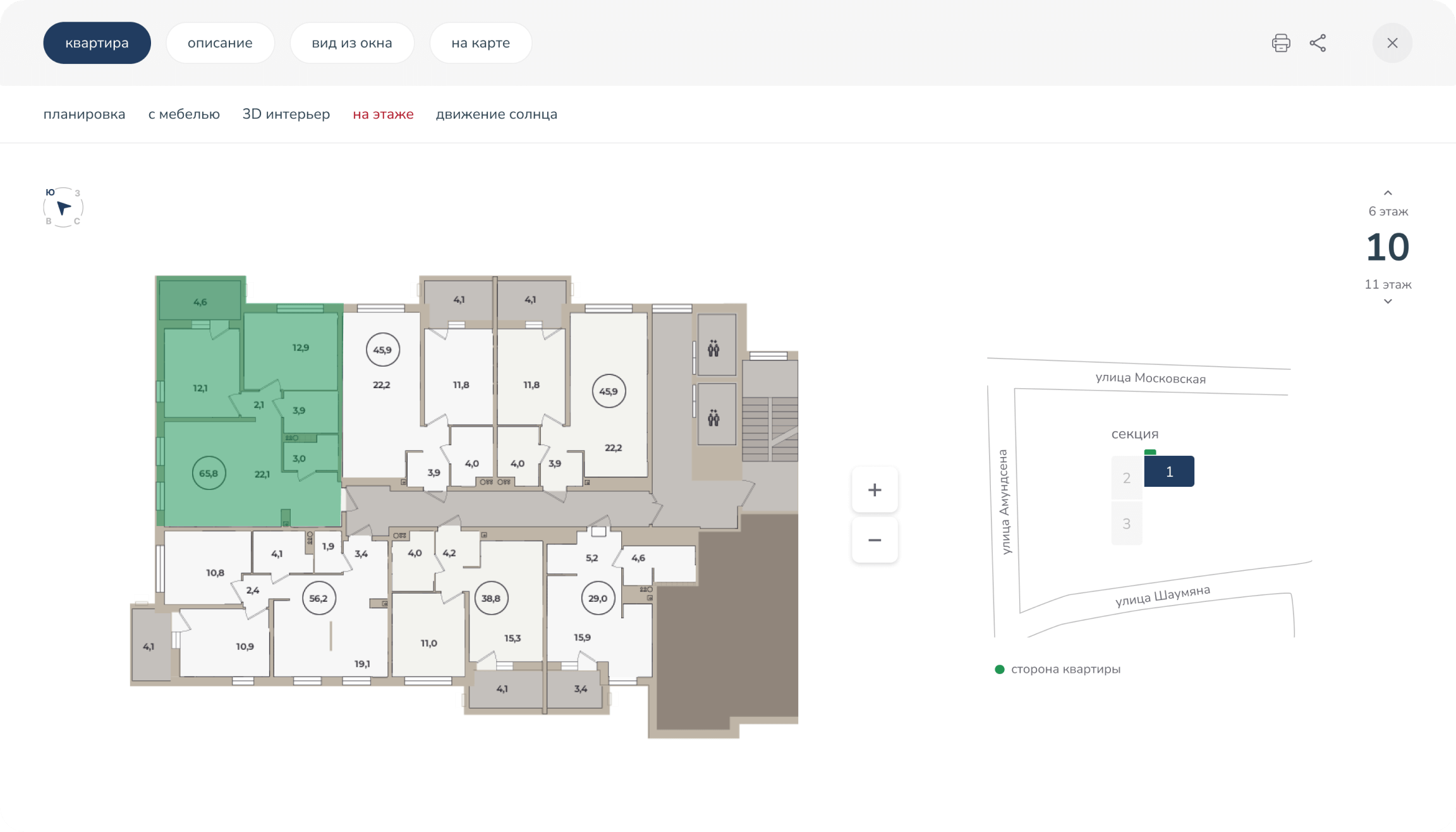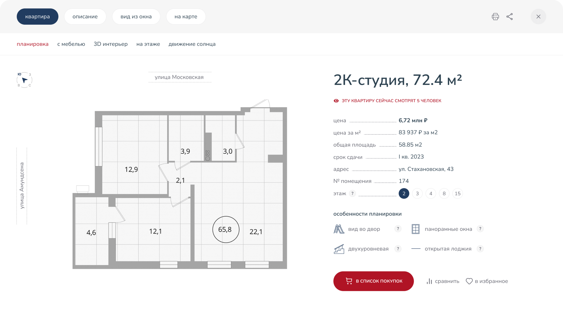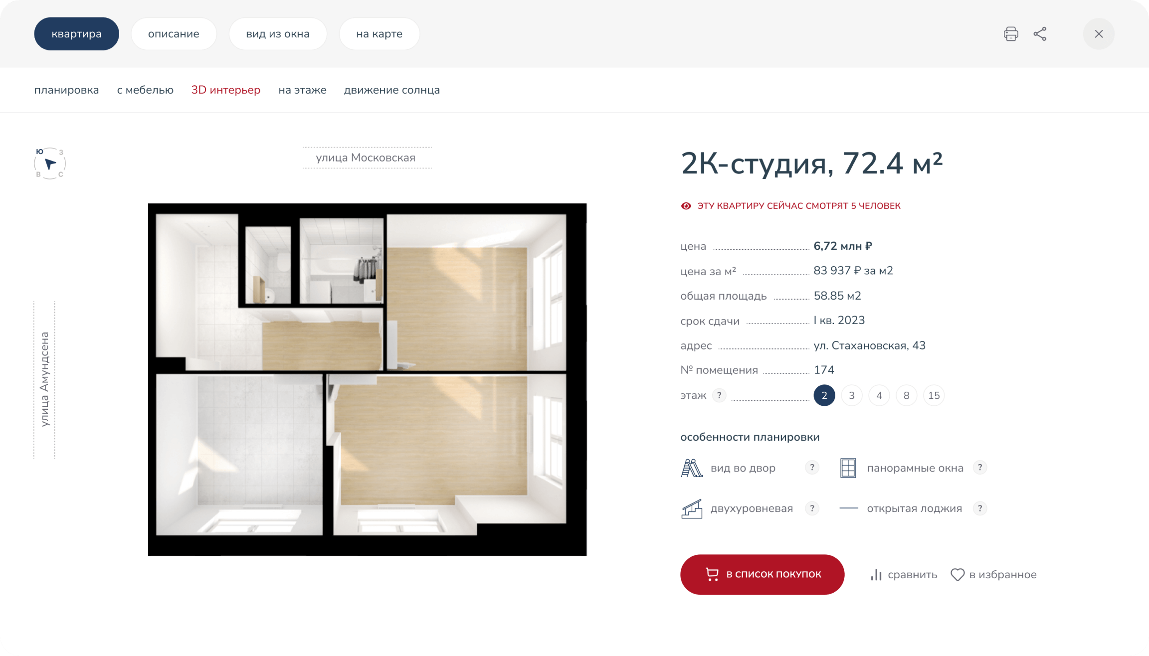 подробной карточки квартиры, с информацией расположения на этаже на генплане, движение солнца, 3D интерьер, вид из окон и тд
