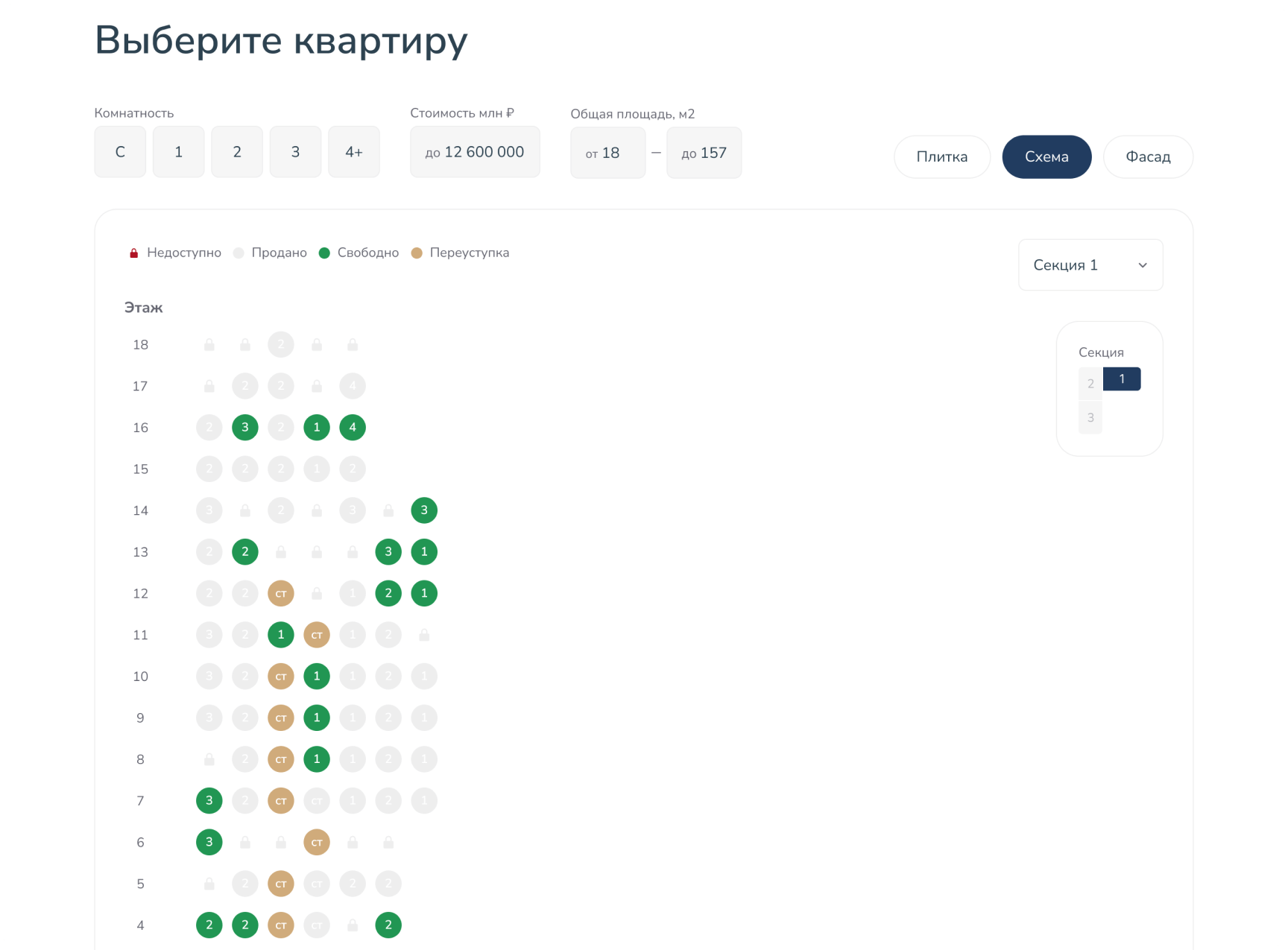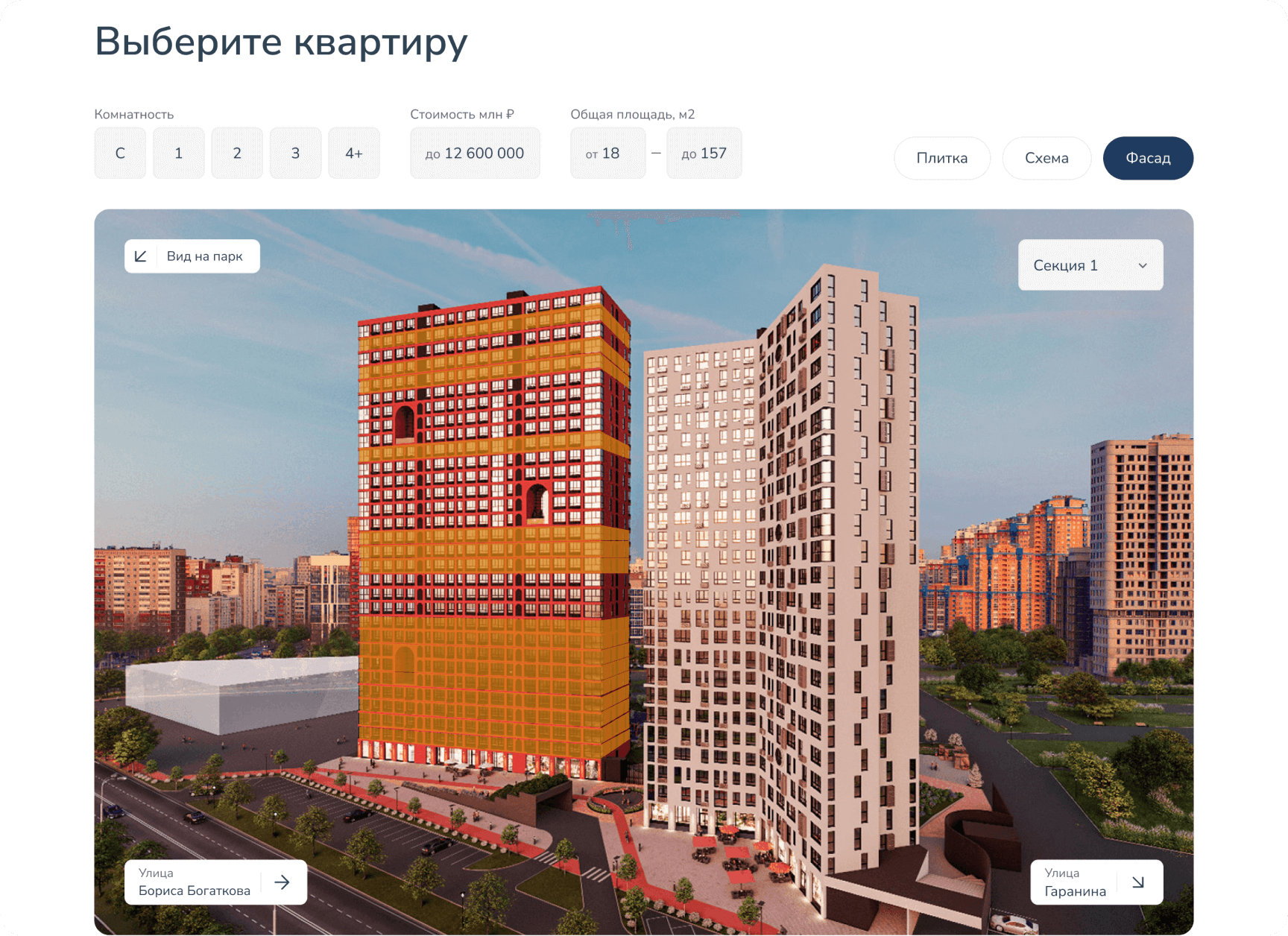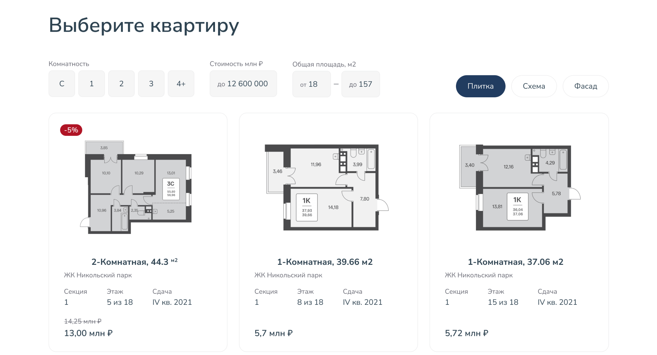 В ходе разработки дизайна мы поняли, что пользователи могут прийти к просмотру карточек планировок несколькими путями: через общий поиск, через планировки конкретного ЖК и фасады, или через «шахматку». Популярные пути и понятный интерфейс мы оставили, а от всего сложного избавились.