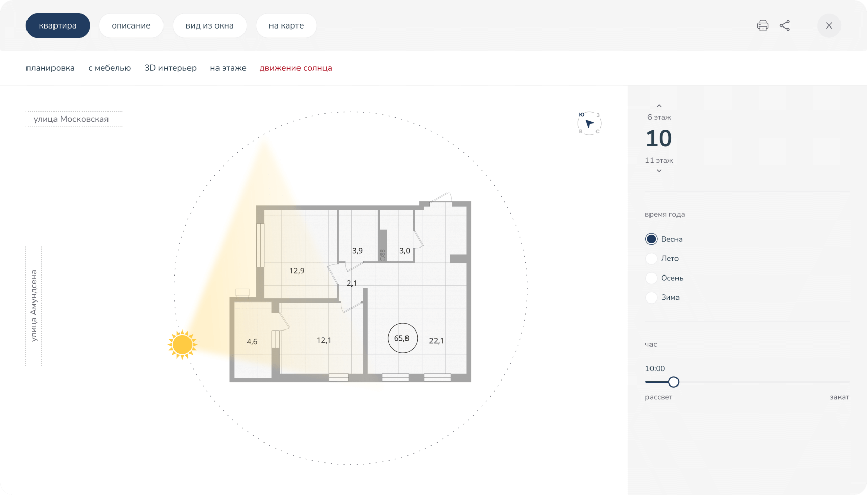Отдельно нужно сказать про эту опцию, которой сильно не хватало у конкурентов. Пользователь не просто видит название сторон света в духе N-E-W-S. Мы наглядно показали движение солнца, причем с выбором времени года и интервала внутри дня. При выборе квартиры это важный фактор для многих